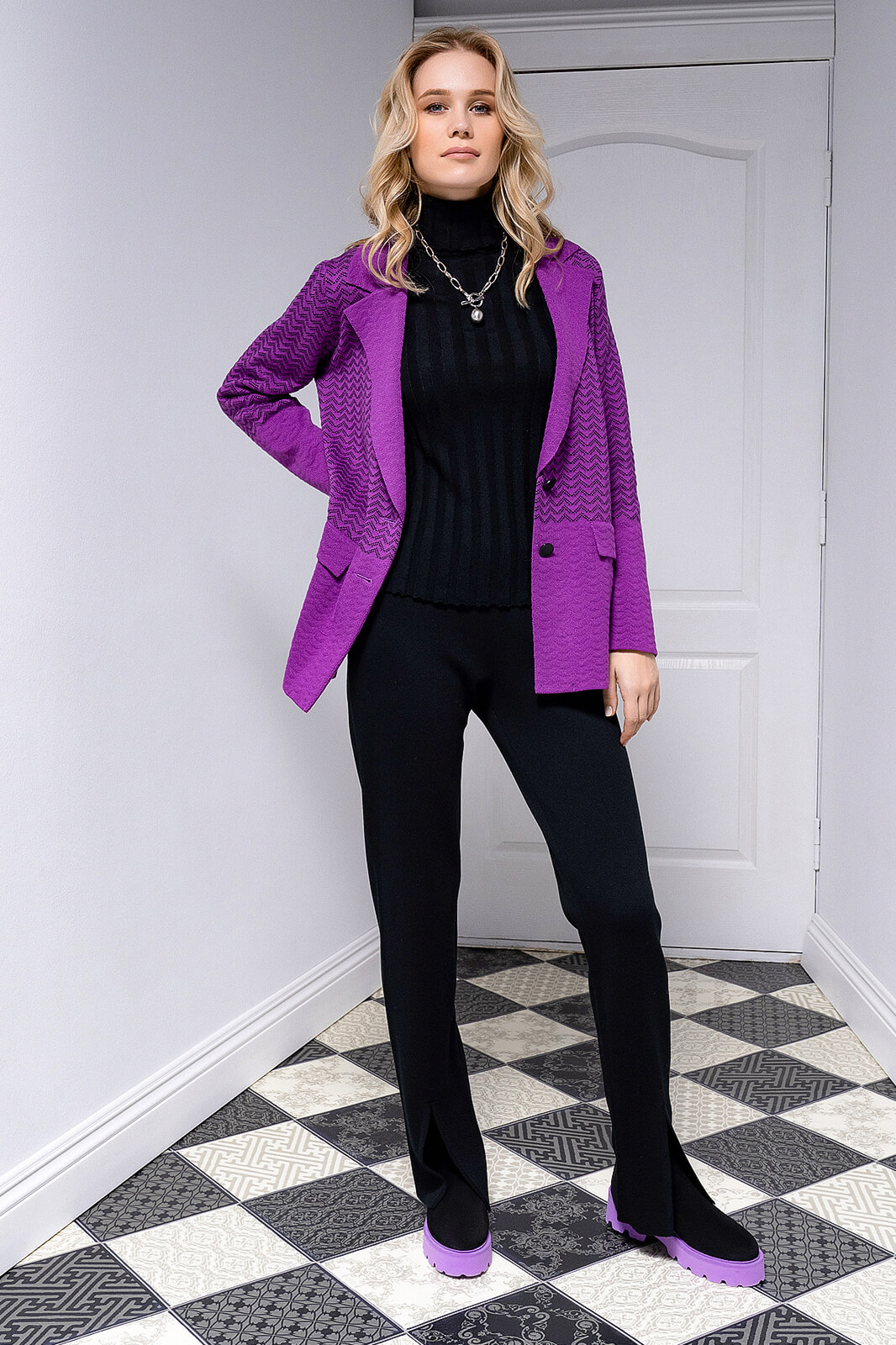 Жакет женский, прямргоо силуэта ,с застежкой — на две пуговицы. Рукав втачной, прямой, длинный.