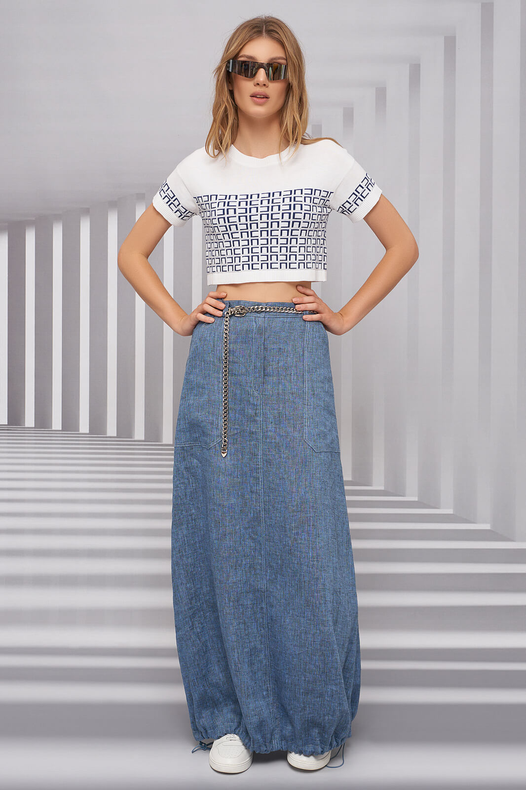 На заднем полотнище юбки расположена кокетка и накладные карманы.