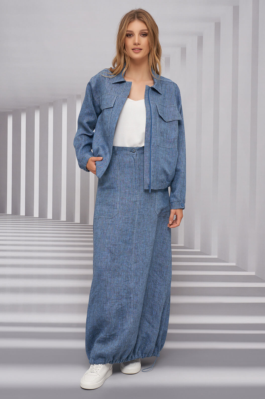 По переду имеется застежка — молния и накладные карманы с клапаном.