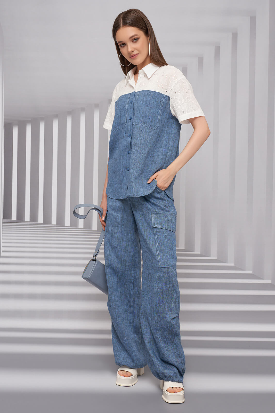 Жакет женский, прямого силуэта, текстильный. Рукав короткий, со спущенной линией плеча. Воротник стояче-отложной. По переду изделия расположены накладные карманы с отделочной строчкой.