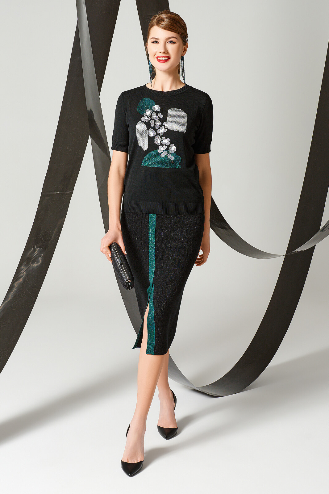 Джемпер женский прямого силуэта. Рукав короткий, втачной. Горловина круглая. Перед джемпера дополнен печатью.