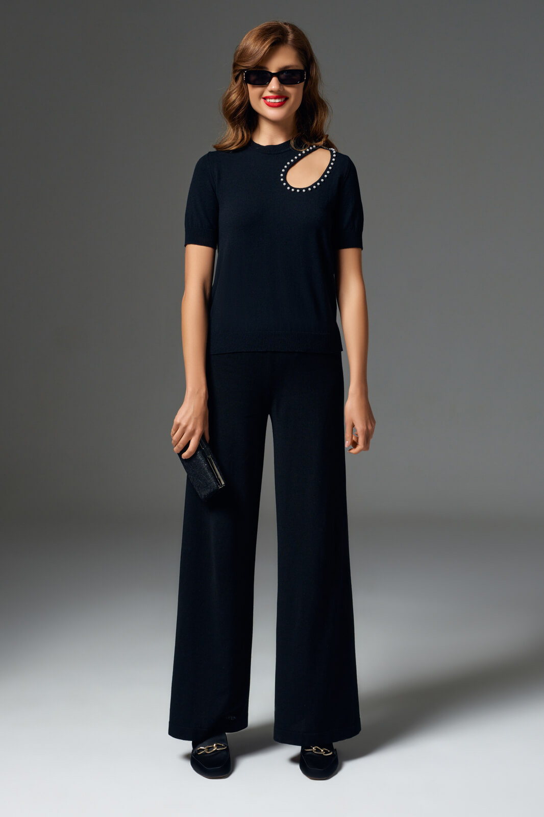 Джемпер женский, прямого, свободного силуэта. Рукав втачной, короткий, прямой. На переде изделия с правой стороны расположен фигурный вырез, который по контуру задекорирован жемчужными бусинами. Горловина круглая.