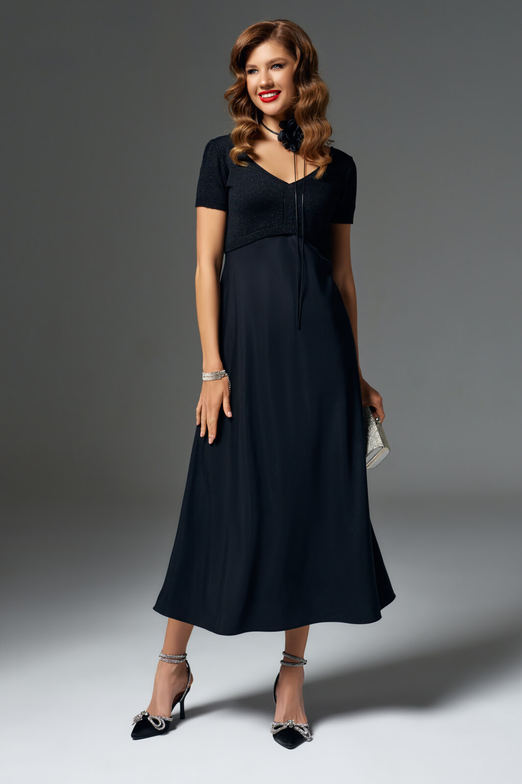 Платье женское, полуприлегающего силуэта сверху и расклешенного в нижней части. Платье с V-образным вырезом горловины по переду и спинке. Рукав втачной, короткий.