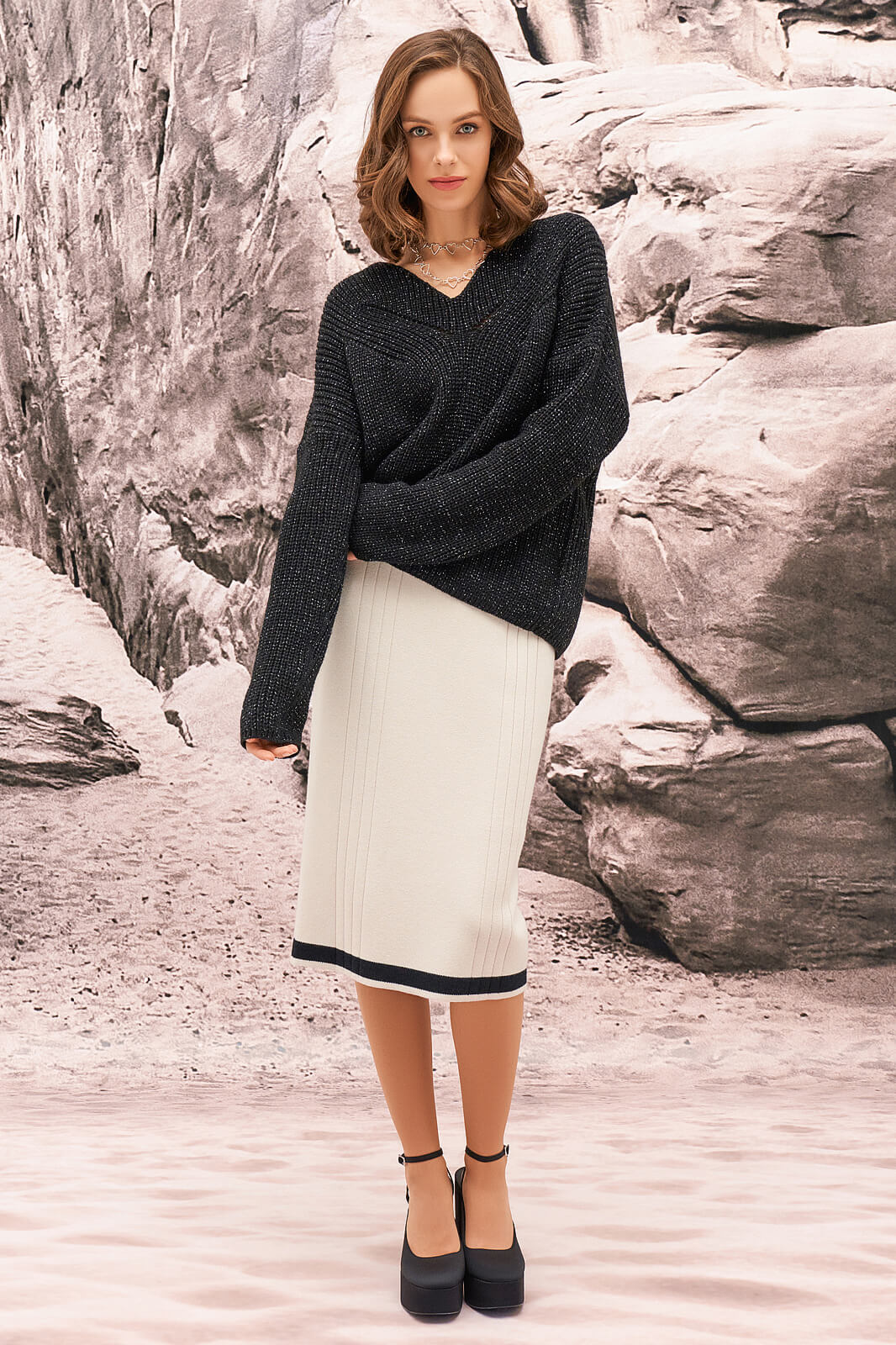 Джемпер женский, свободного силуэта. с вывязанной V-образной горловиной. Рукав длинный, со спущенной линией плеча.