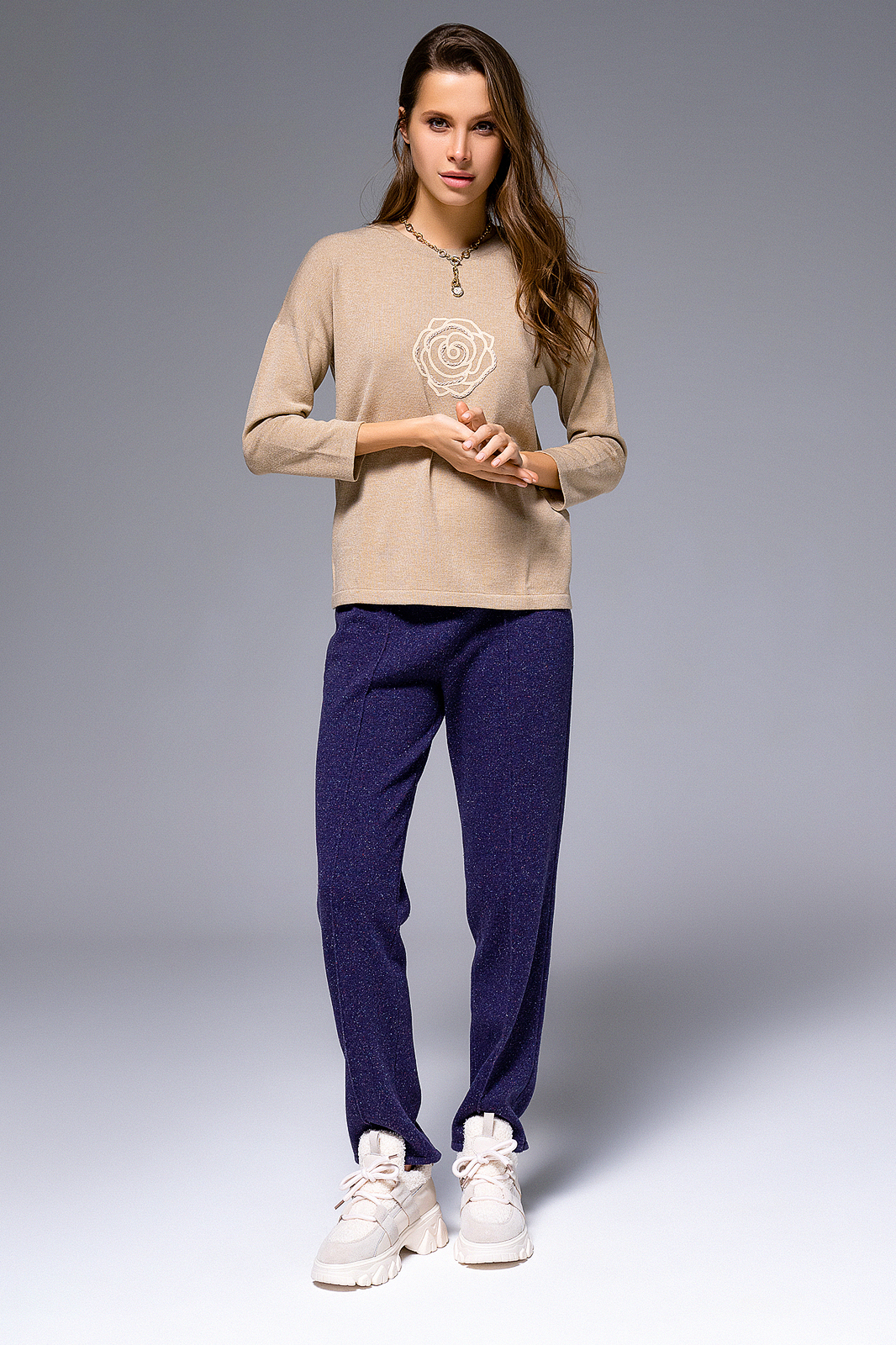 Джемпер женский, прямого силуэта, однотонный. Рукав втачной, длиной 3/4, со спущенной линией плеча. Джемпер по переду дополнен печатью и ручной вышивкой,