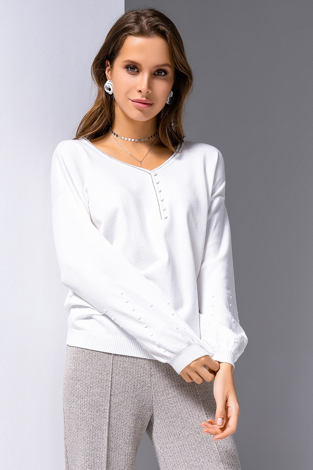 Джемпер женский, прямого силуэта . Рукав длинный, со спущенной линией плеча, на манжете. Вырез горловины V-образный, с имитацией застёжки на планку на 6 пуговиц на ножке.