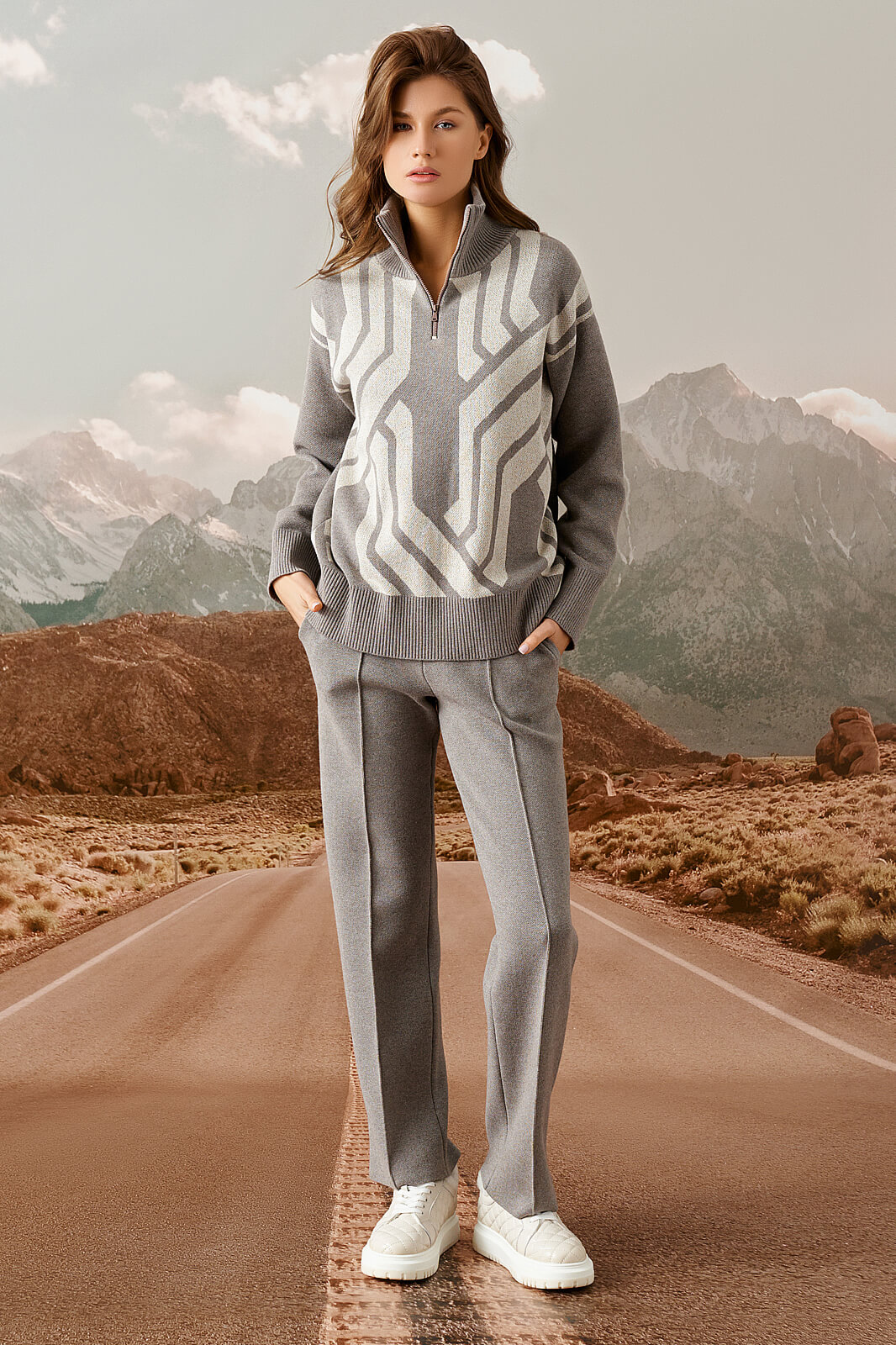 Джемпер, женский прямого силуэта. Рукав длинный, со спущенной линией плеча. Горловина круглая заработана ластиком — стойкой с функциональной застёжкой молнией.