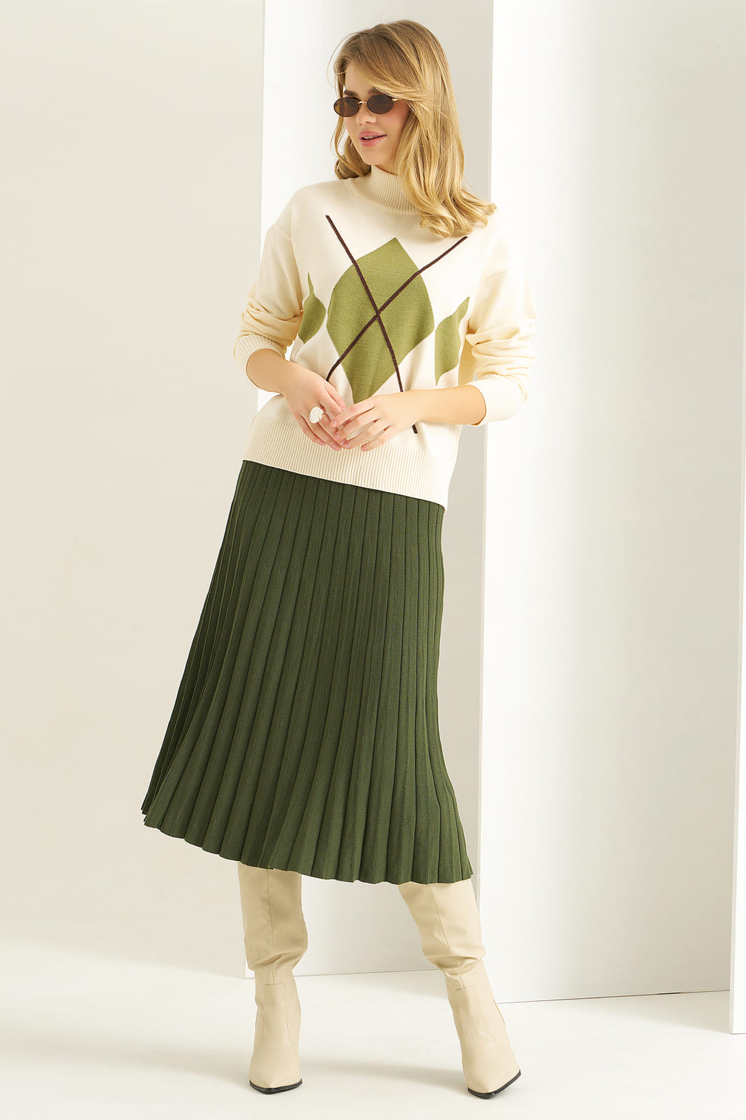 Свитер женский, свободного силуэта. Горловина округлой формы с высоким ластиком всгиб. Рукав длинный, со спущенной линией плеча. По переду вывязан рисунок в виде композиции ромбов