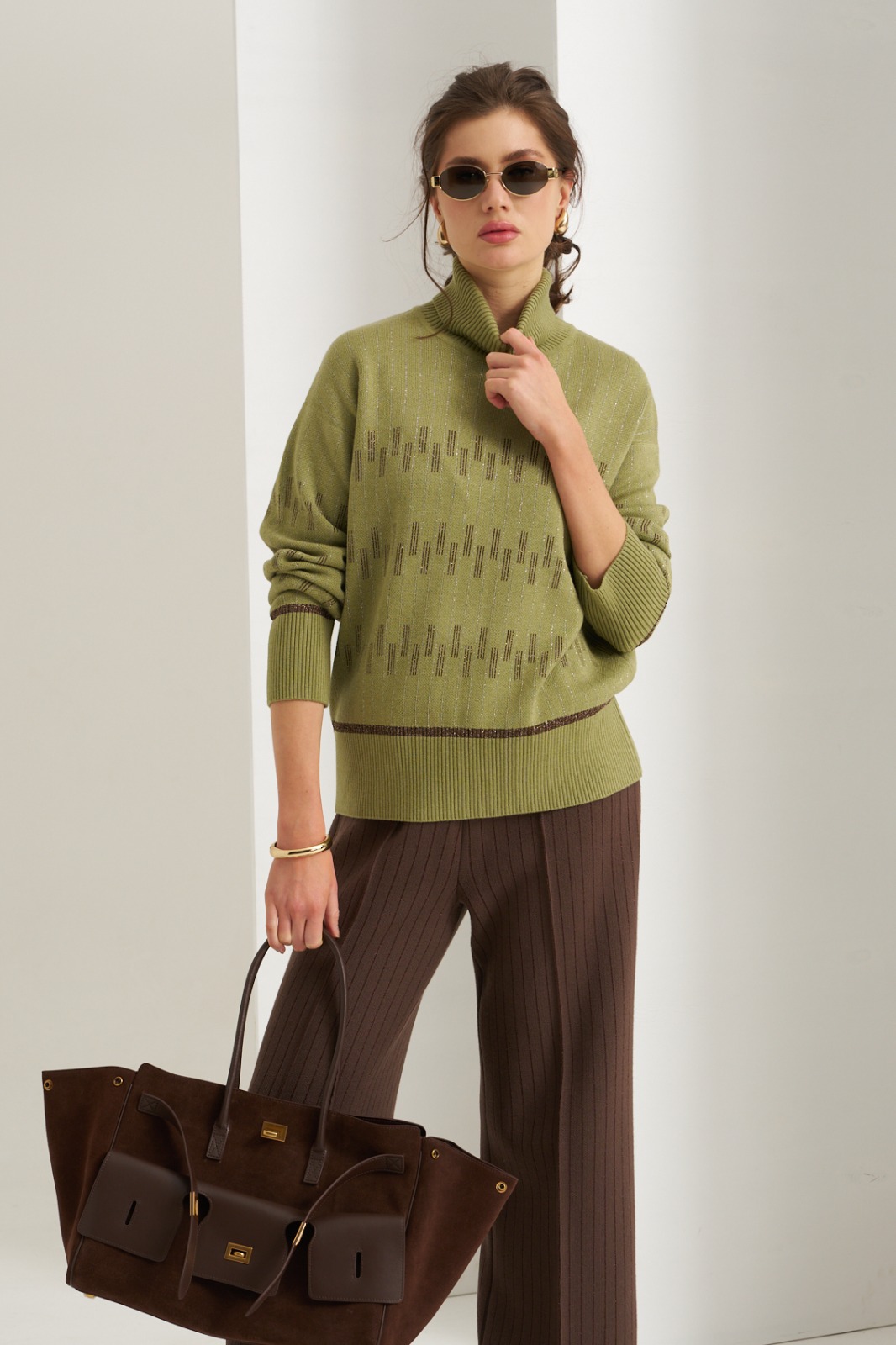 Свитер женский, прямого силуэта. Рукав длинный, со спущенной линией плеча. Горловина кругая заработана воротником стойкой.