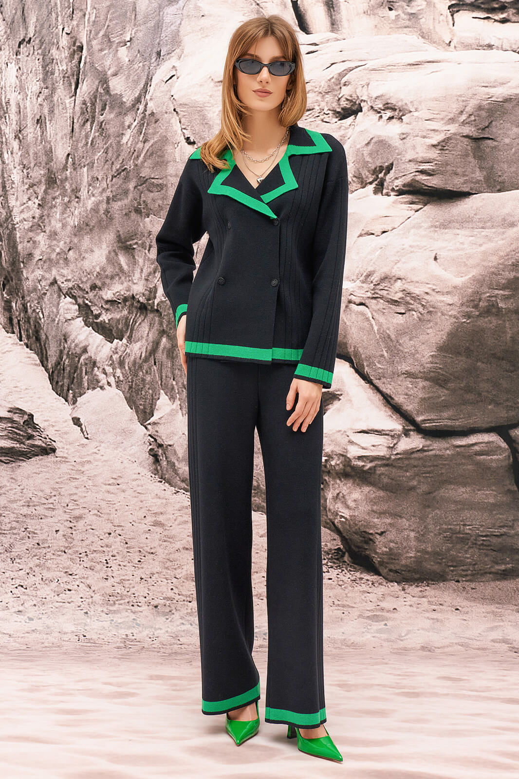 Жакет женский, прямого, свободного силуэта, с отложным воротником пиджачного типа. Рукав втачной, длинный. На переде изделия расположена застёжка на 2 функциональные пуговицы и 1 потайную.