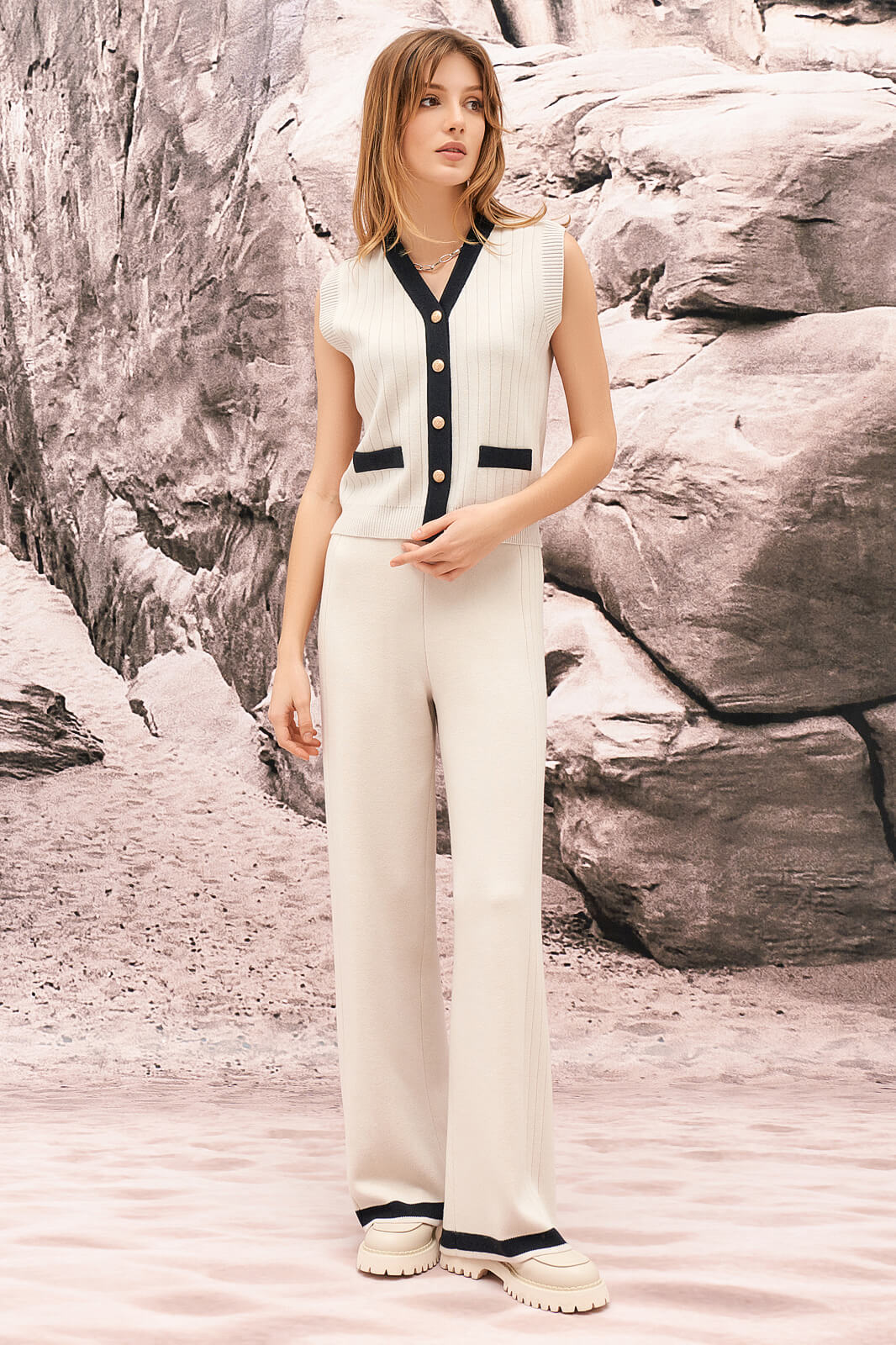 Жилет женский, прямого силуэта. Горловина V-образная с планкой, застёгивающейся на 5 пуговиц. На переде изделия расположены декоративные листочки.