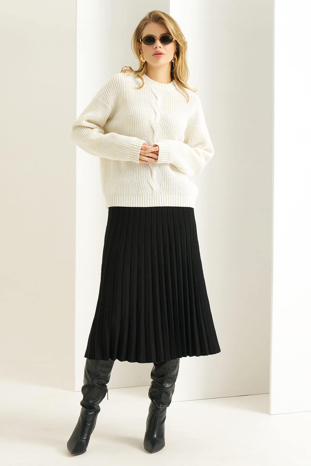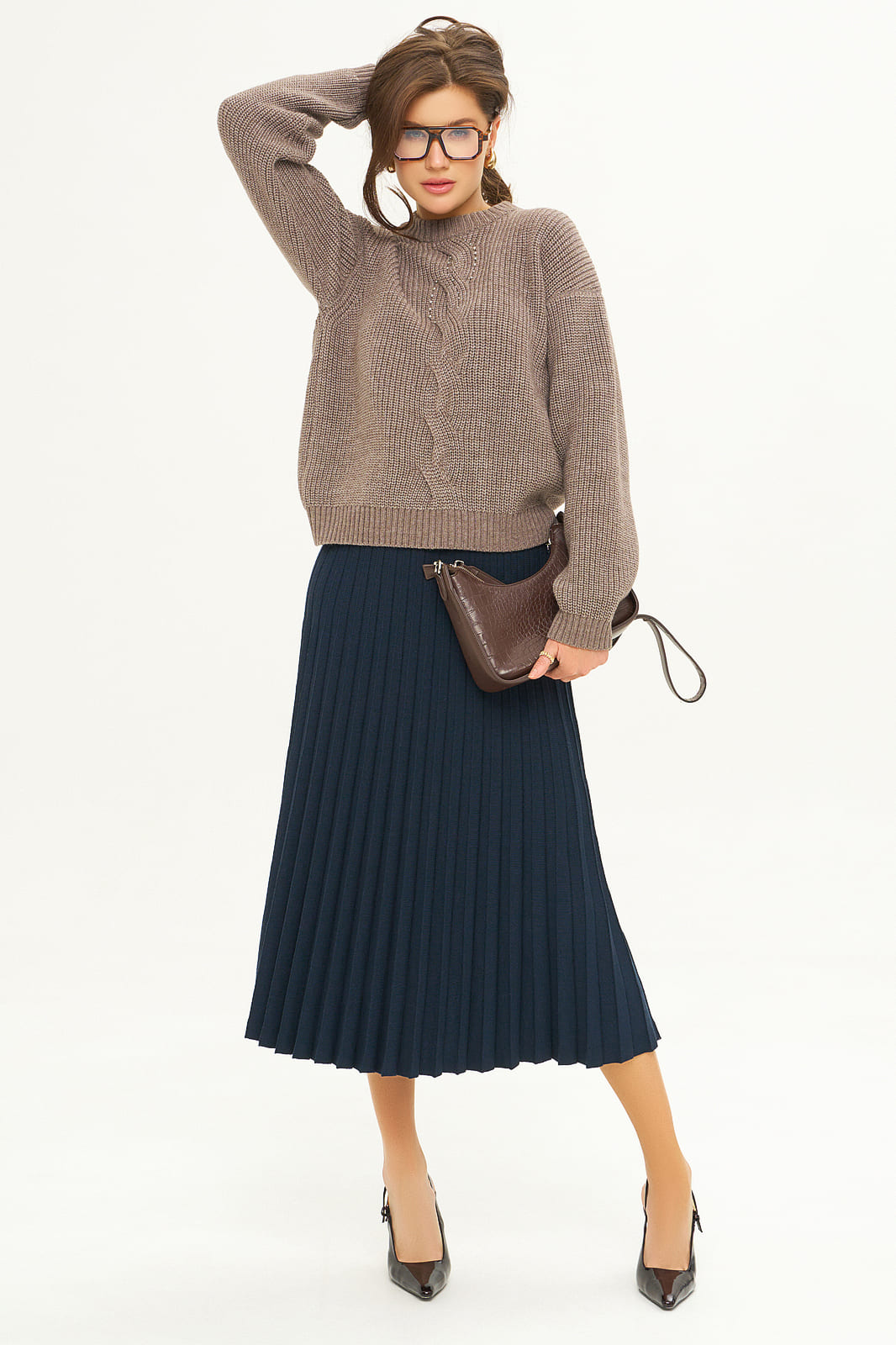 Джемпер женский, прямого силуэта. Рукав длинный, со спущенной линией плеча. Горловина круглая По переду вывязан декоративный элемент, дополненный пришивными бусинами.