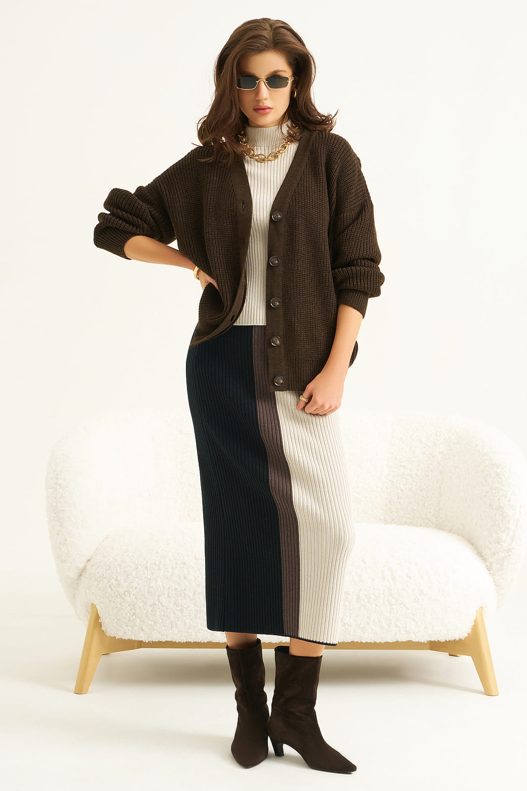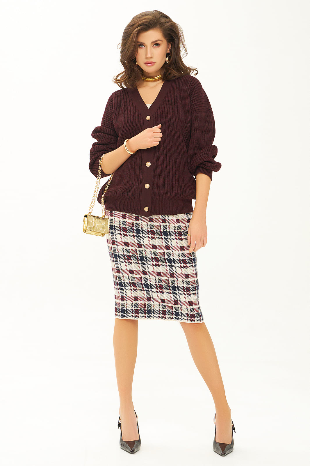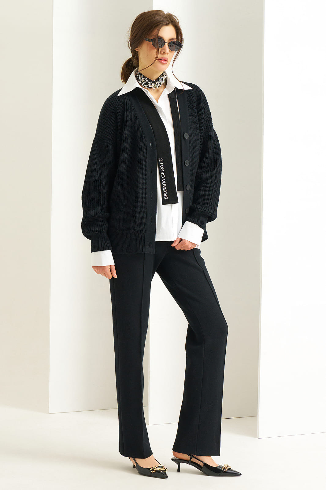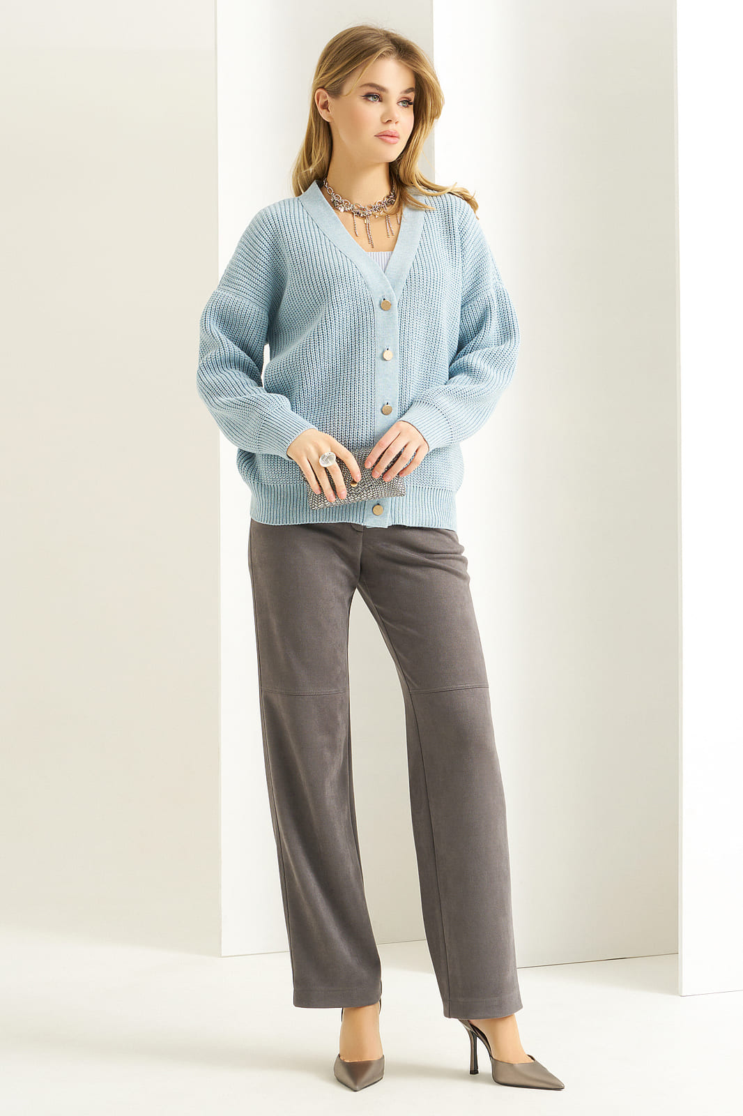 Кардиган женский, объемного силуэта. Рукав длинный, со спущенной линией плеча. Вырез V-образный, застёжка-планка на петли и пуговицы.