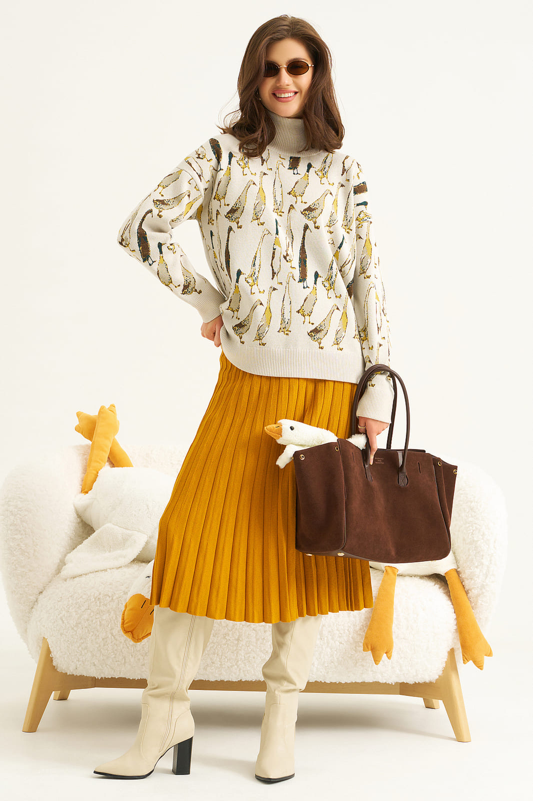 Свитер женский, свободного силуэта. Рукав длинный, со спущенной линией плеча. Воротник-стойка.
