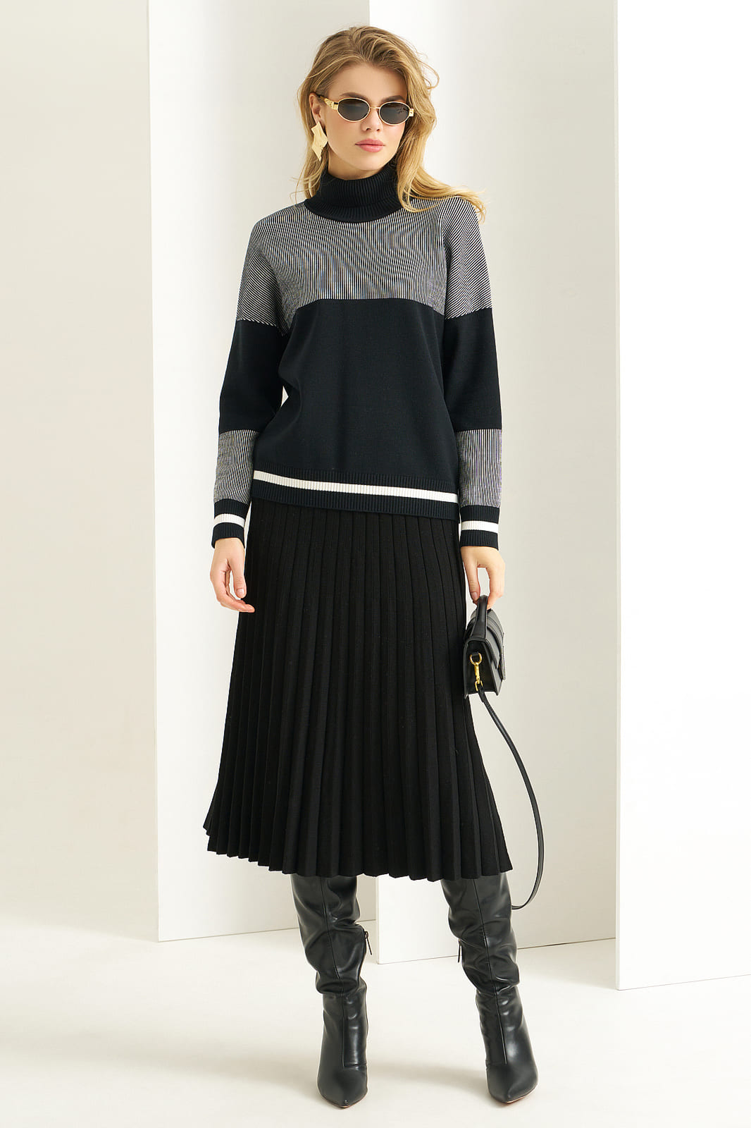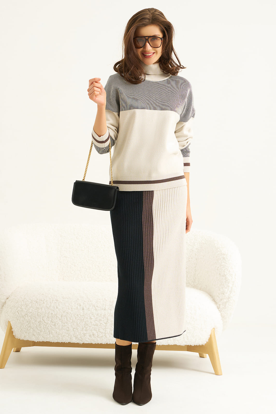 Свитер женский, свободного силуэта. Рукав длинный, со спущенной линией плеча. Воротник-стойка с отворотом.